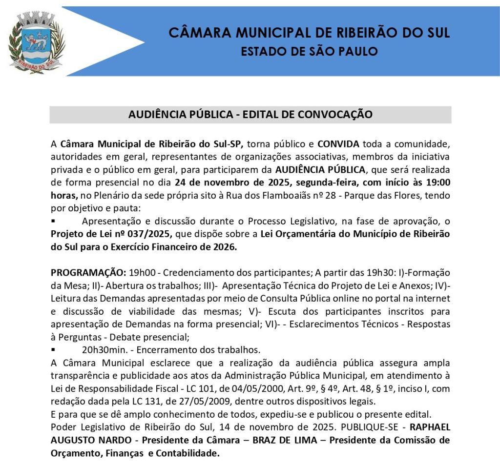 A Câmara Municipal de Ribeirão do Sul convida toda a população para a discussão da Proposta da Lei Orçamentária Anual - LOA, para o Exercício de 2026 - Projeto de Lei nº 37/2025, de 29 de agosto de 2025. O objetivo principal é promover a discussão de assunto de amplo interesse público entre os Poderes Executivo e Legislativo, demais autoridades e com a sociedade em geral, proporcionando total transparência e publicidade aos atos da administração pública, especialmente quanto às questões que envolvem o Planejamento e Orçamento Municipal de nosso Município. |